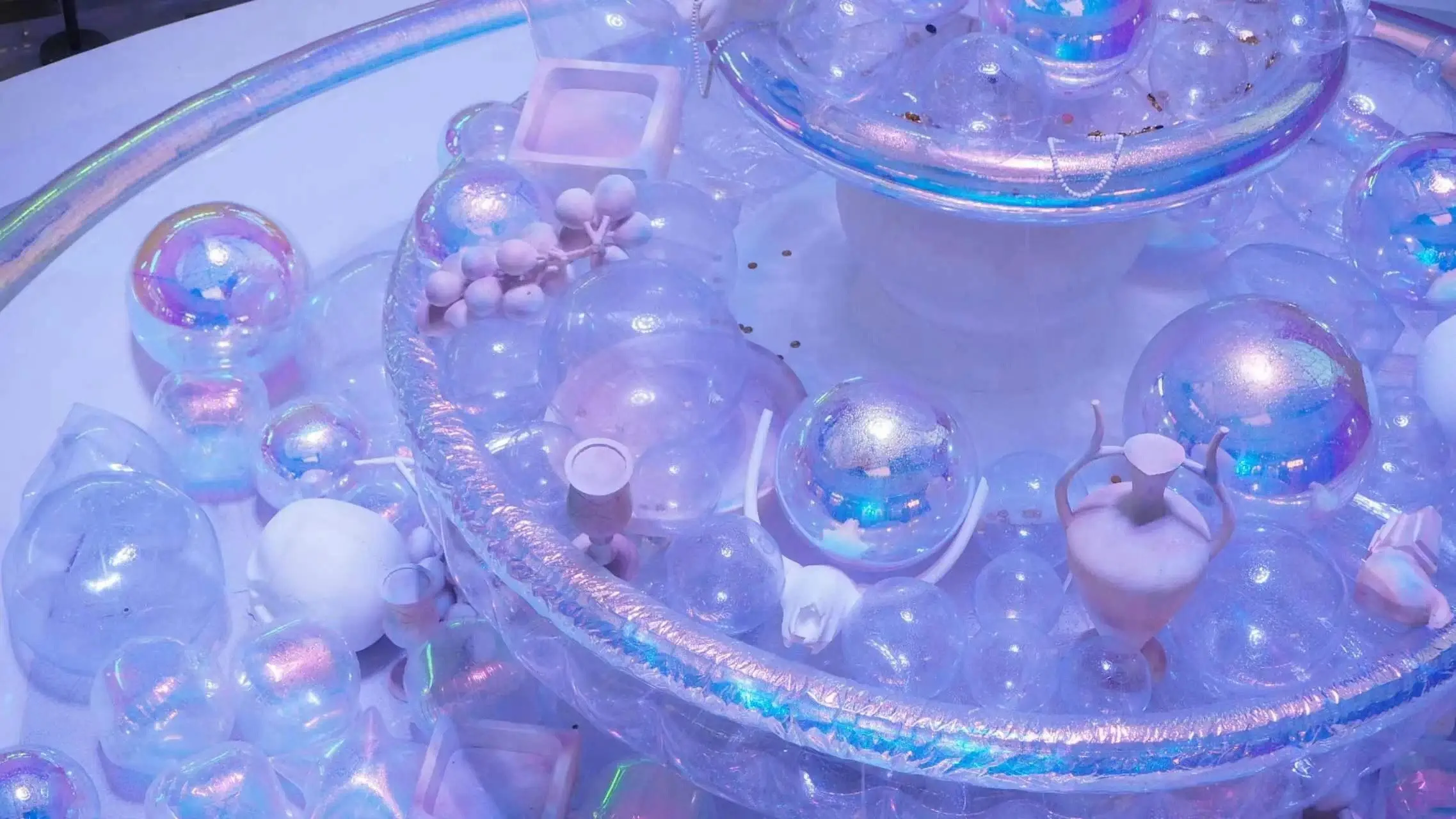 The fountain shape of the wishing pool is constructed by using colorful air models, and the work implies a utopian world. People can feel the power of water and the vitality of life through the fountain's water flow, flooding fictional consumer goods, making the fountain a place for people to relax and enjoy art. By researching the classical confectionery plate modeling, the use of device modeling to create a feast overlooking. Utilizing music, light and shadow effects, the installation creates an atmosphere of emotional resonance for the audience. The combination of the installation with the still life arrangement and the collision of different materials and objects allows the audience to deeply feel the emotional impact and experience brought about by the passage of time and the change of life. The installation can reflect the changes of history and modernity, and the audience can feel the change of time in the works and reflect on the preciousness and transience of life.